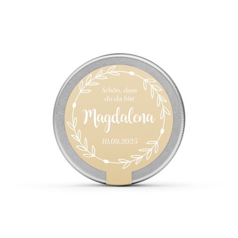 Jede Dose wird individuell für euch gestaltet und trägt eure Namen sowie das Hochzeitsdatum – ein einzigartiges Andenken an euren großen Tag.